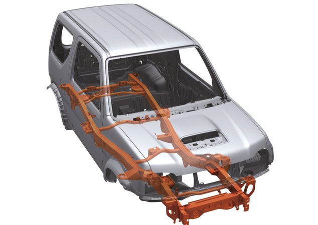 Отдельного внимания заслуживает конструкция силового каркаса кузова и рамы. Они спроектированы таким образом, чтобы обеспечить эффективное поглощение и рассеивание энергии удара в случае столкновения. Обеспечению высокого уровня защиты в таких ситуациях способствуют также и специальные брусья в дверях Suzuki Jimny.